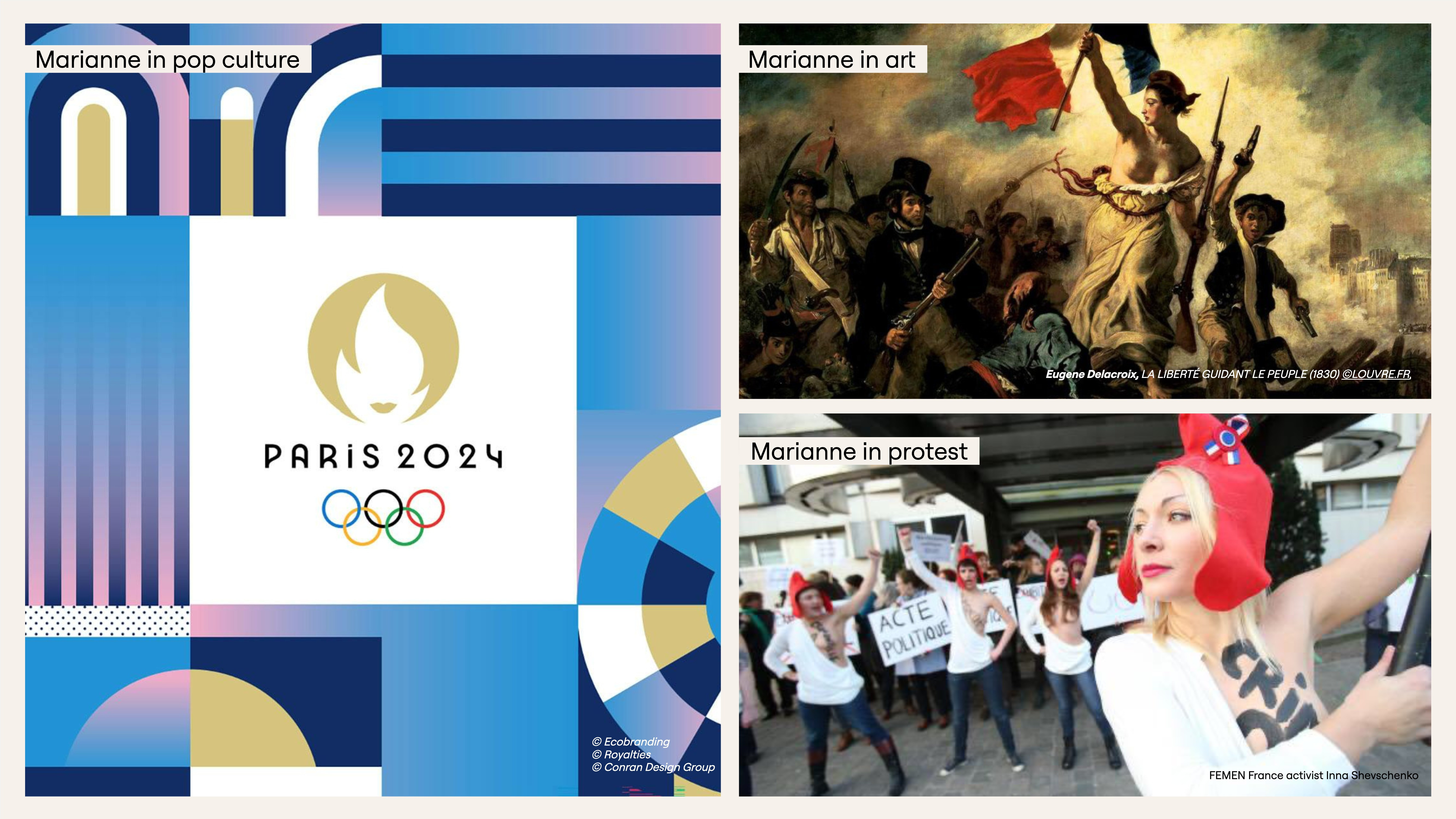 It’s no accident then, that the 2024 Paris brandmark (logo) is a symbol of a female face, an embodiment of Marianne who is an allegorical figure - a fictional symbol most famously brought to life in the iconic New York Statue of Liberty landmark. Portrayed as a goddess in the 1830 painting "Liberty Leading the People" by Eugene Delacroix's, she has since been re-expressed in sculpture, film, fashion, postage stamps and now as an inspired symbol of the 2024 Paris Olympics, integrated with the Olympic flame. This abstract homage was designed through a national competition in 2018 won by independent French branding agency, Royalties - the inventors of the sustainable corporate design methodology Ecobranding™. The Paris Olympic and Paralympic Games both share the same emblem, reflecting the Olympic brand vision to revolutionise the Games with greater equity and inclusion.